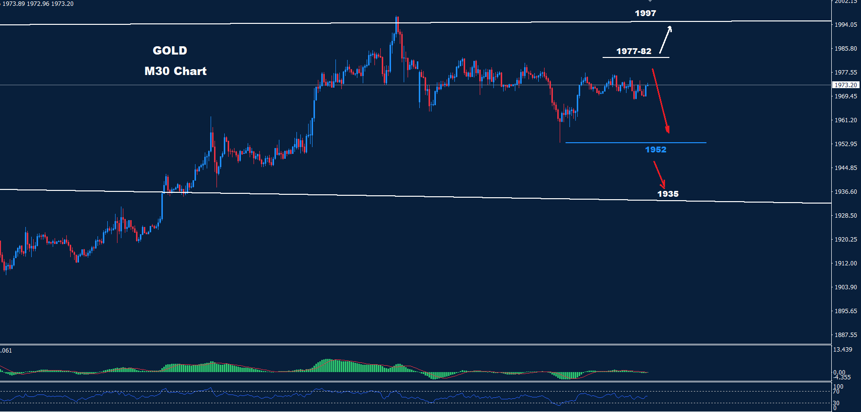 كما نرى على الرسم البياني، يواجه السوق أول مقاومة خلال اليوم عند مستويات 82-1977 حيث طالما استمر السوق في الاحتفاظ بالتداولات تحت هذا المستوى، فمن المتوقع حدوث انخفاض آخر نحو مناطق 1952.