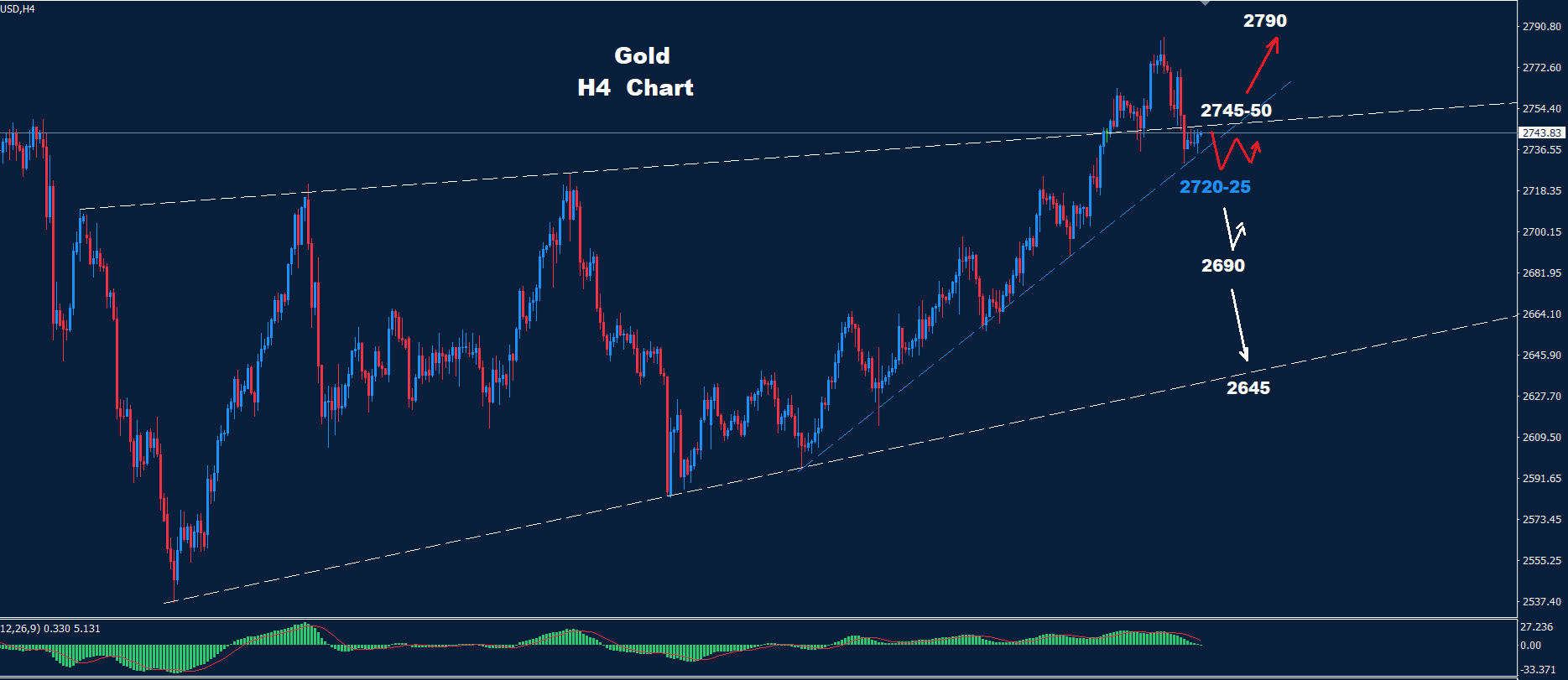 كما نرى على الرسم البياني، فإن مستويات اليوم تظهر منطقة تداول محتملة بين مستوى الدعم 25-2720 ومستوى المقاومة 50-2745
