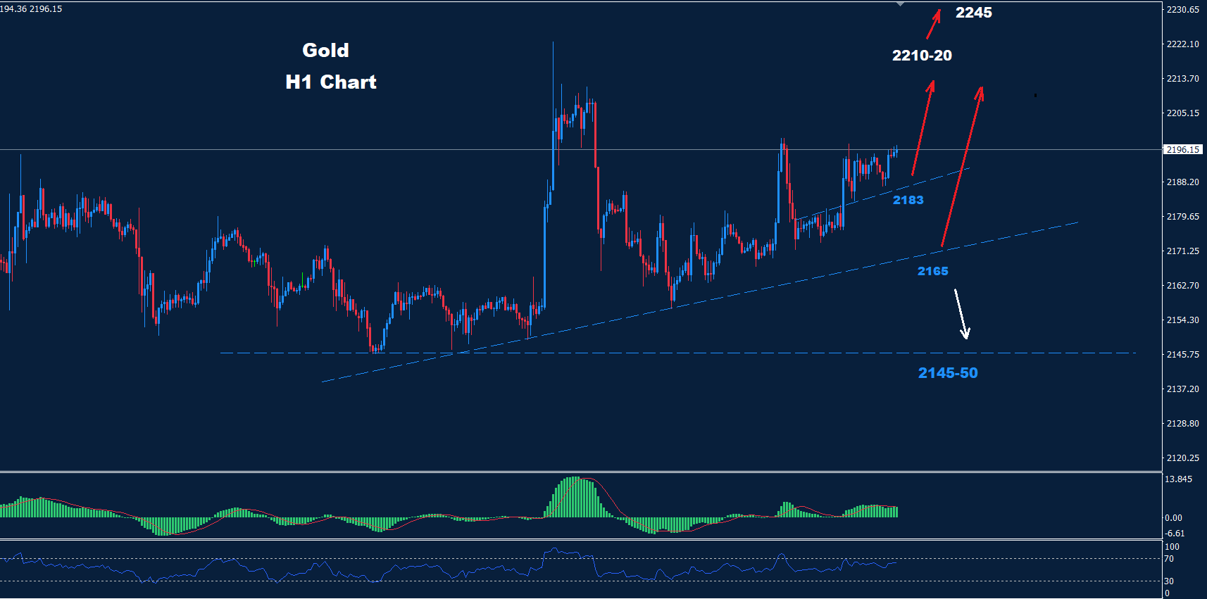 كما نرى على الرسم البياني للمدى اليومي، يواجه السوق الدعم حول 2183 و 2165 حيث طالما استمر السوق في الحفاظ على التداولات فوق أحد هذين الدعمين، فقد تستمر الموجة المتقدمة نحو المنطقة 20-2210.