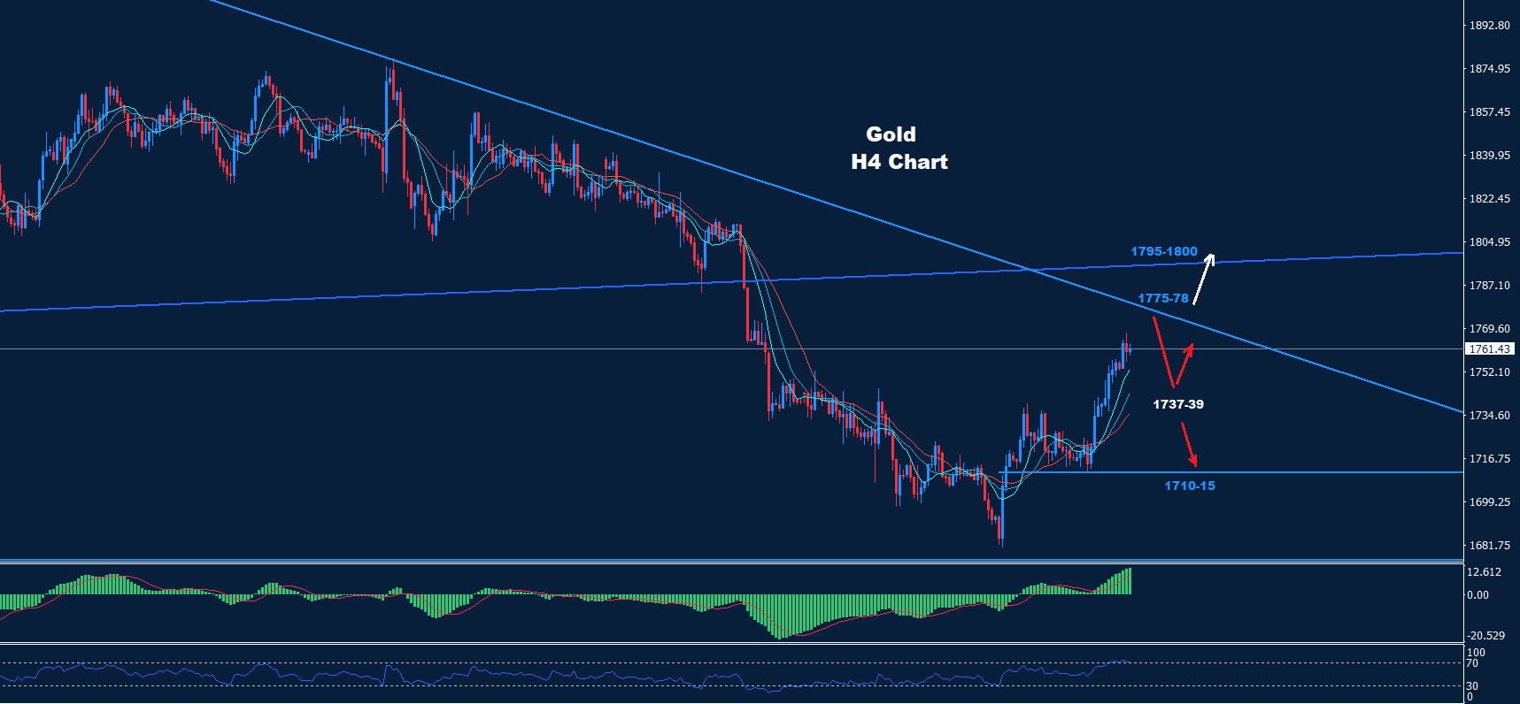 تمكن الذهب من اختراق مستوى المقاومة 1755 مما قد يضيف المزيد من الحركة المتقدمة لاختبار خط المقاومة 78-1775.