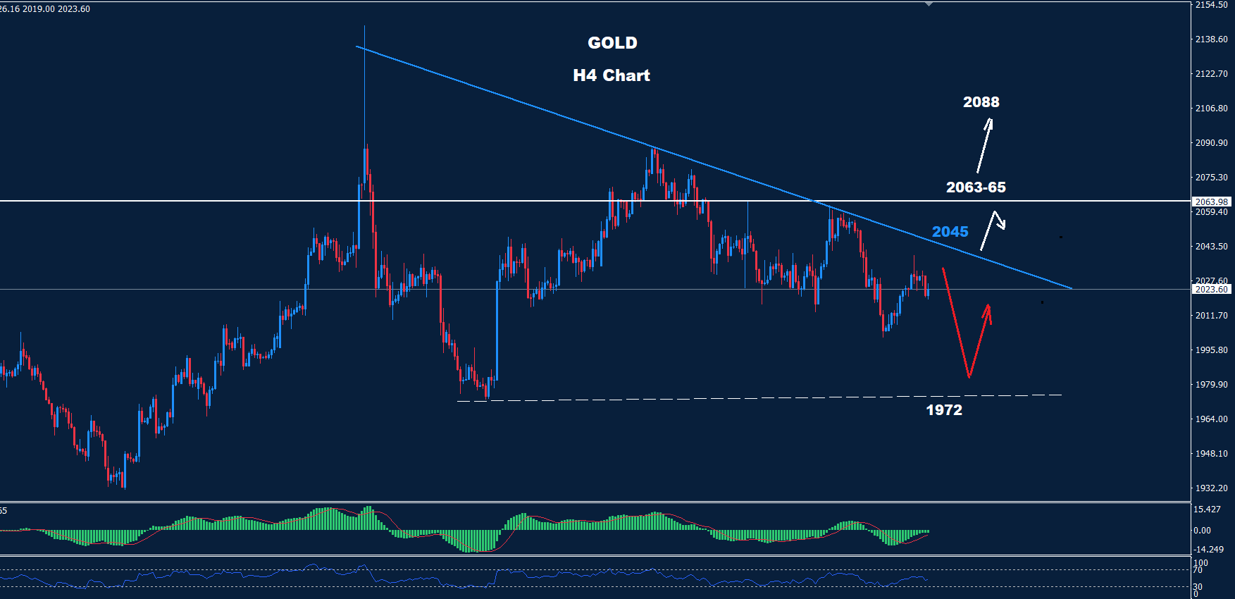 كما نصحنا الأسبوع الماضي وكما نرى على الرسم البياني السابق، تظهر مستويات المدى اليومي مقاومة الترند الهابط حول مناطق 2045 مما قد يبقي ضغط الانخفاض على الذهب لمواصلة الانخفاض حيث قد يعطي الدعم 1972 فرصة للتصحيح الارتدادي.