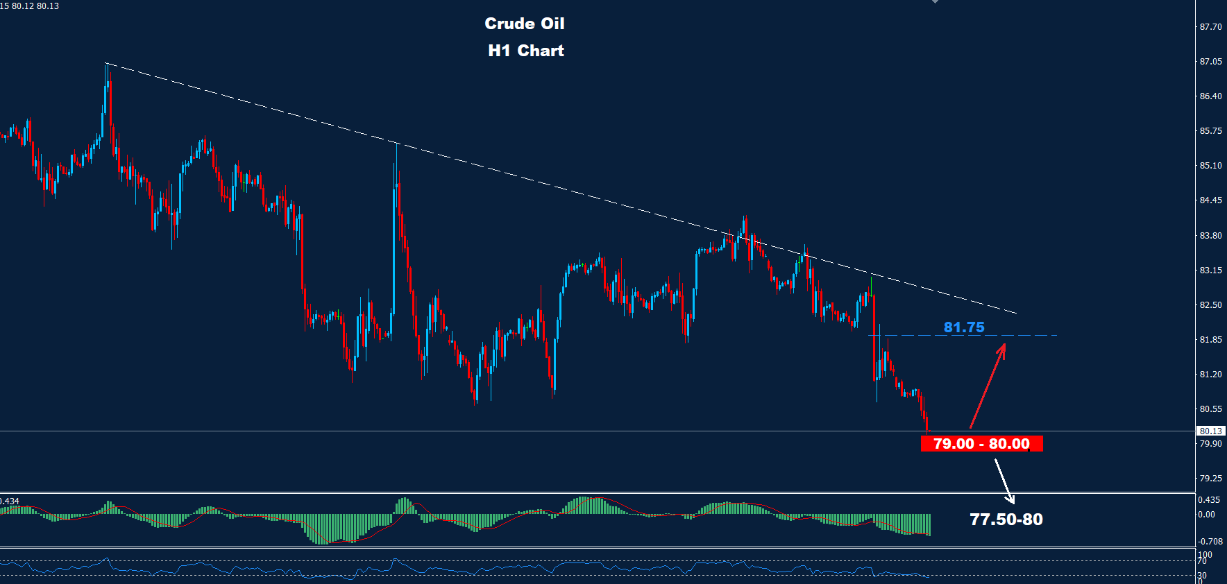 تمكن النفط الخام من كسر مستوى 81.75 حيث تمكن من استئناف الانخفاض والبدء اليوم باختبار منطقة الدعم 79.00-80.00.