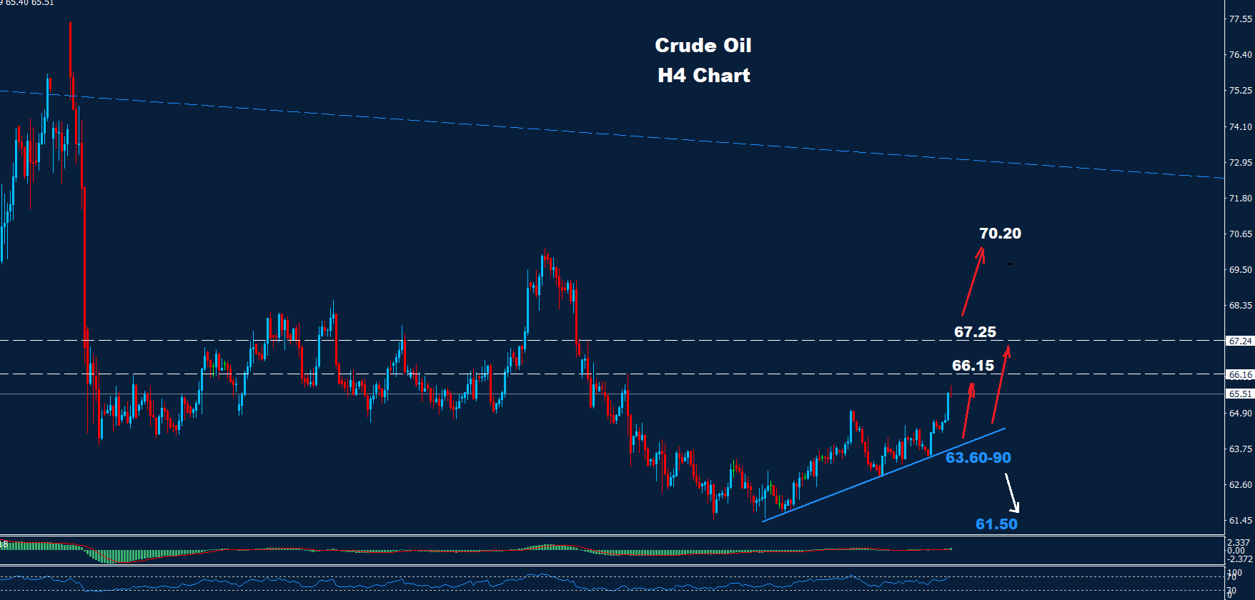 نجح النفط الخام في اختراق مستوى المقاومة 65.00، مما قد يدفعه لمزيد من الارتفاع نحو 69.00 كما أشرنا سابقًا.