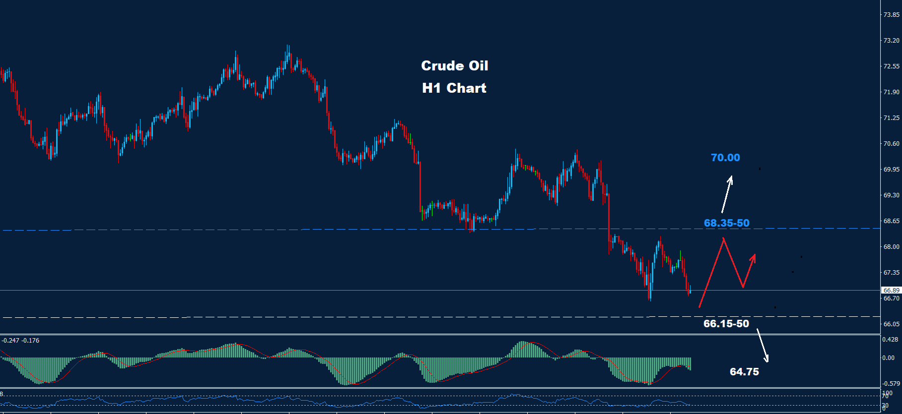 تمكن النفط الخام من الوصول مرة أخرى إلى الهدف 68.35 بينما تمكن من الاختراق تحته والاقتراب من منطقة الهدف 50-66.15