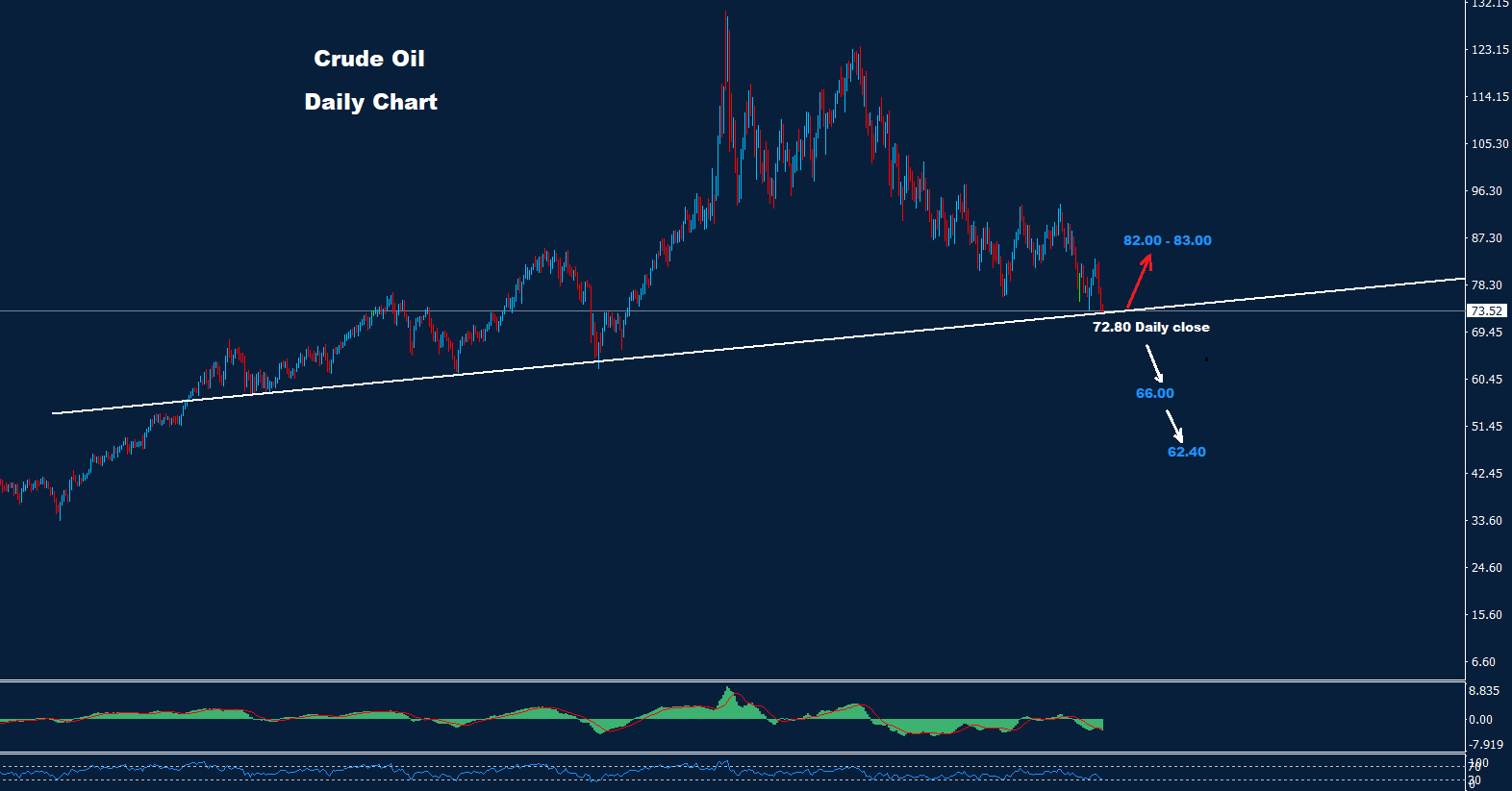 تمكن النفط الخام من استئناف الانخفاض حيث تمكن اليوم من اختبار دعم الاتجاه قصير المدى حول 72.80.
