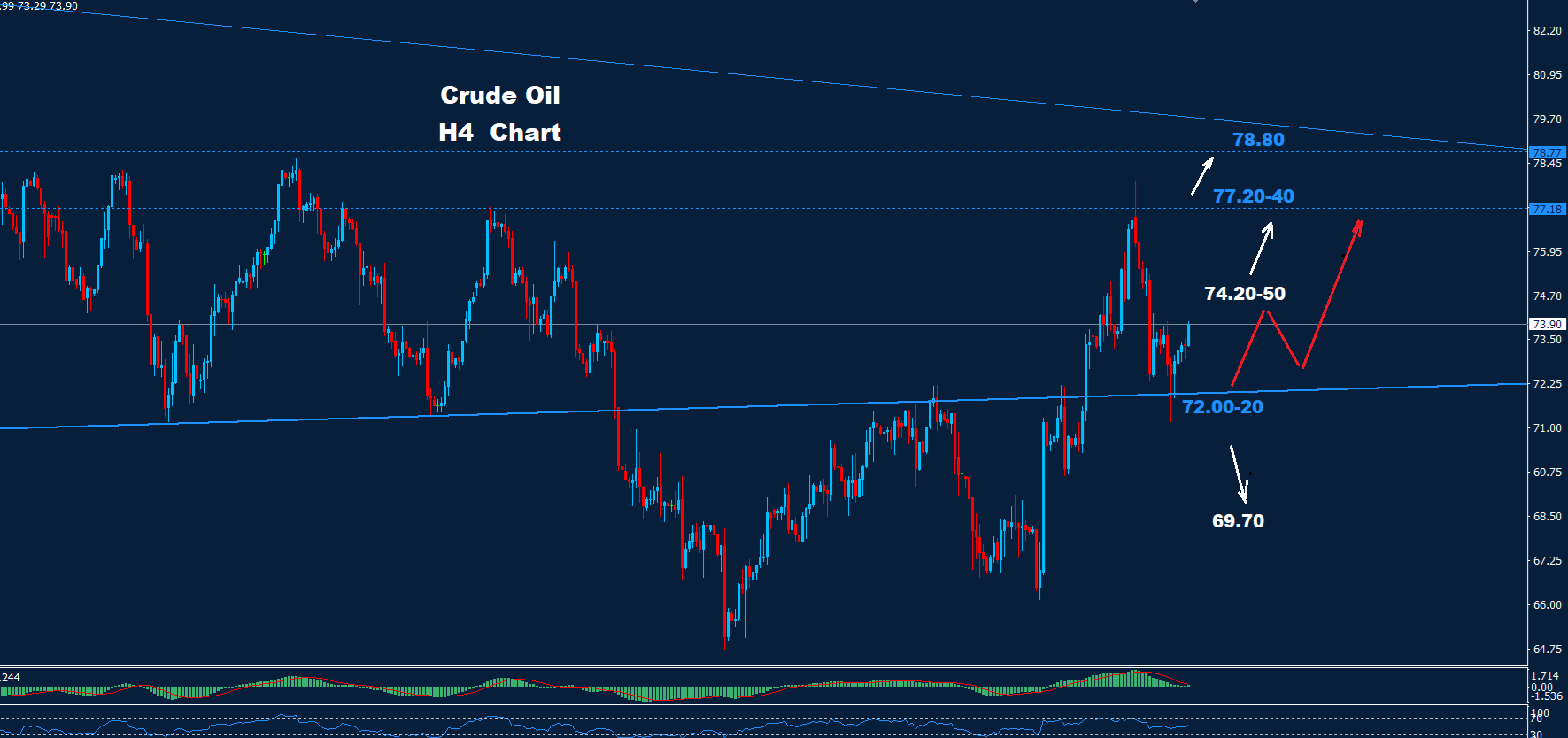 تمكن النفط الخام من الهبوط إلى ما دون مستوى الدعم 72.00 أمس، كما يشيرالرسم البياني السابق إلى تمكن السوق من التعافي بسرعة ليحقق إغلاقًا يوميًا فوق مستوى الدعم 72.00، مما يحافظ على موجة التقدم حتى الآن.