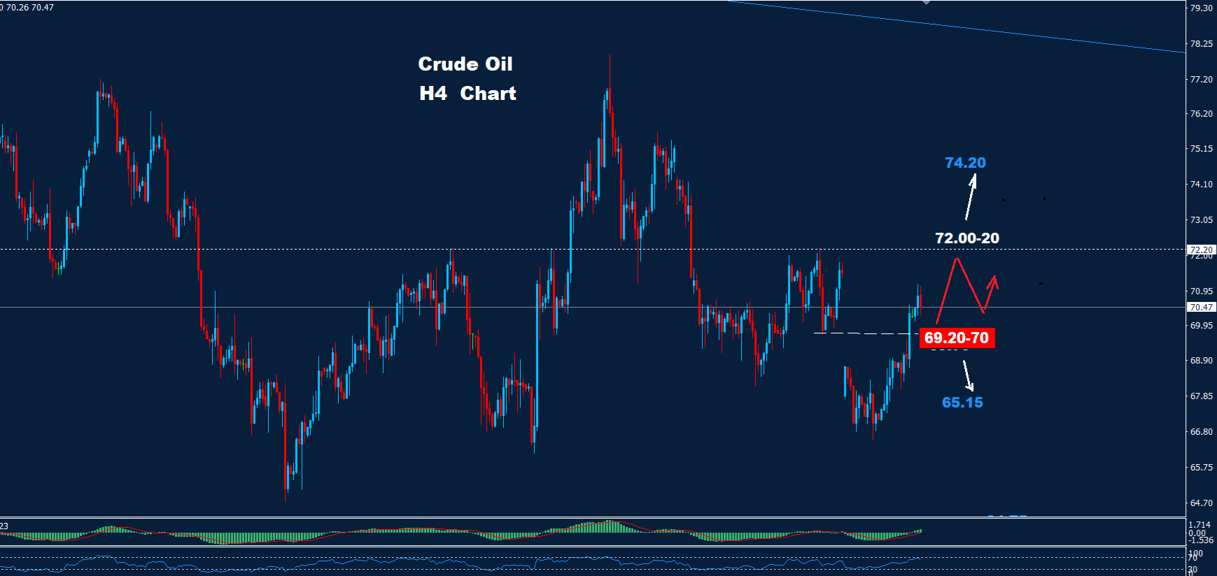 كما نرى على الرسم البياني فإن السوق يواجه الآن منطقة تداول محتملة بين الدعم 70-69.20 والمقاومة 20-72.00