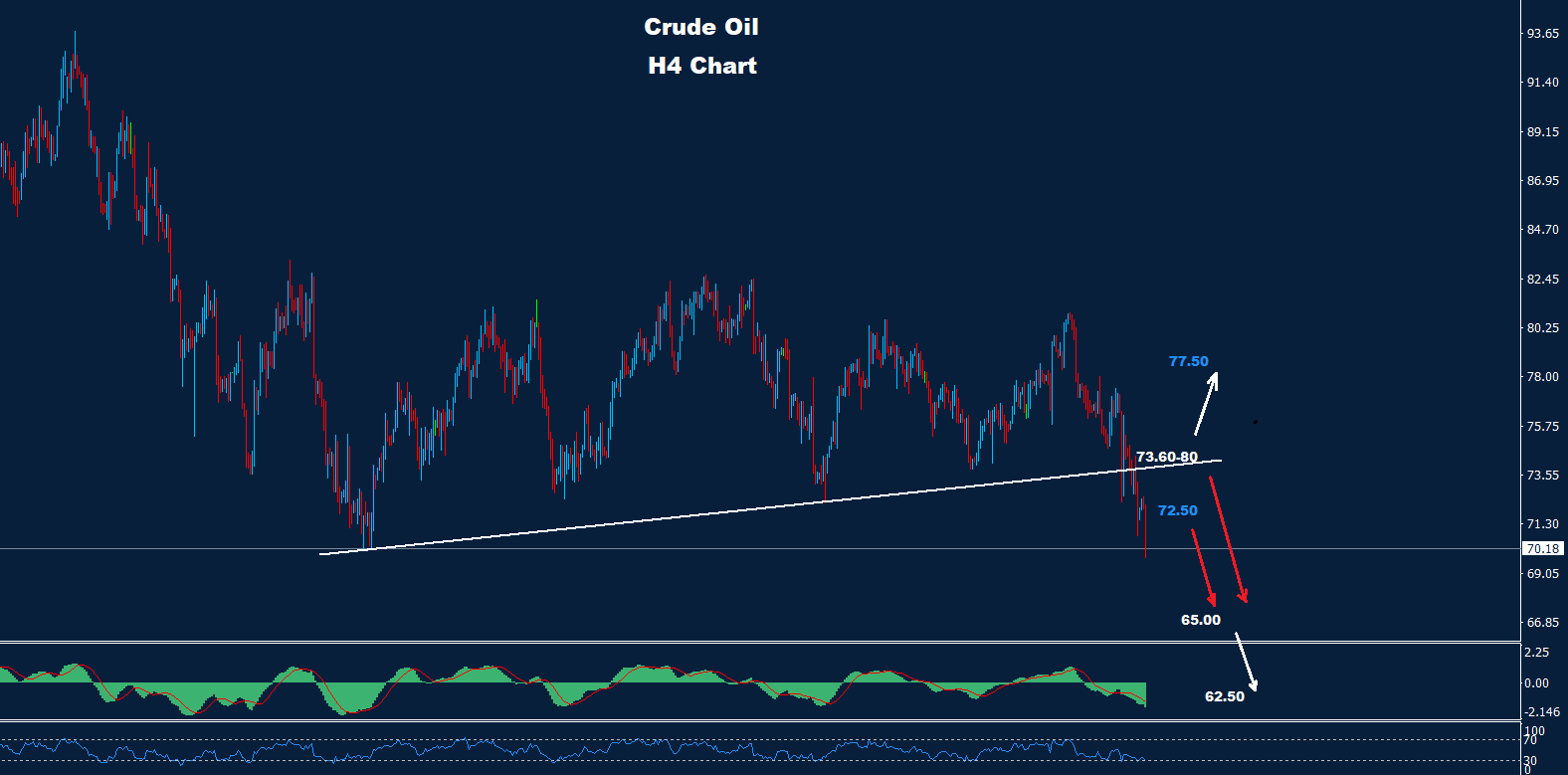 كما نرى على الرسم البياني، يواجه السوق الآن مقاومة حول 72.50 و73.80 حيث طالما استمر السوق في الاحتفاظ بالتداولات تحت أحد هذه المستويات، فإن موجة الاتجاه الهبوطي ستستمر نحو 65.00 و62.50.