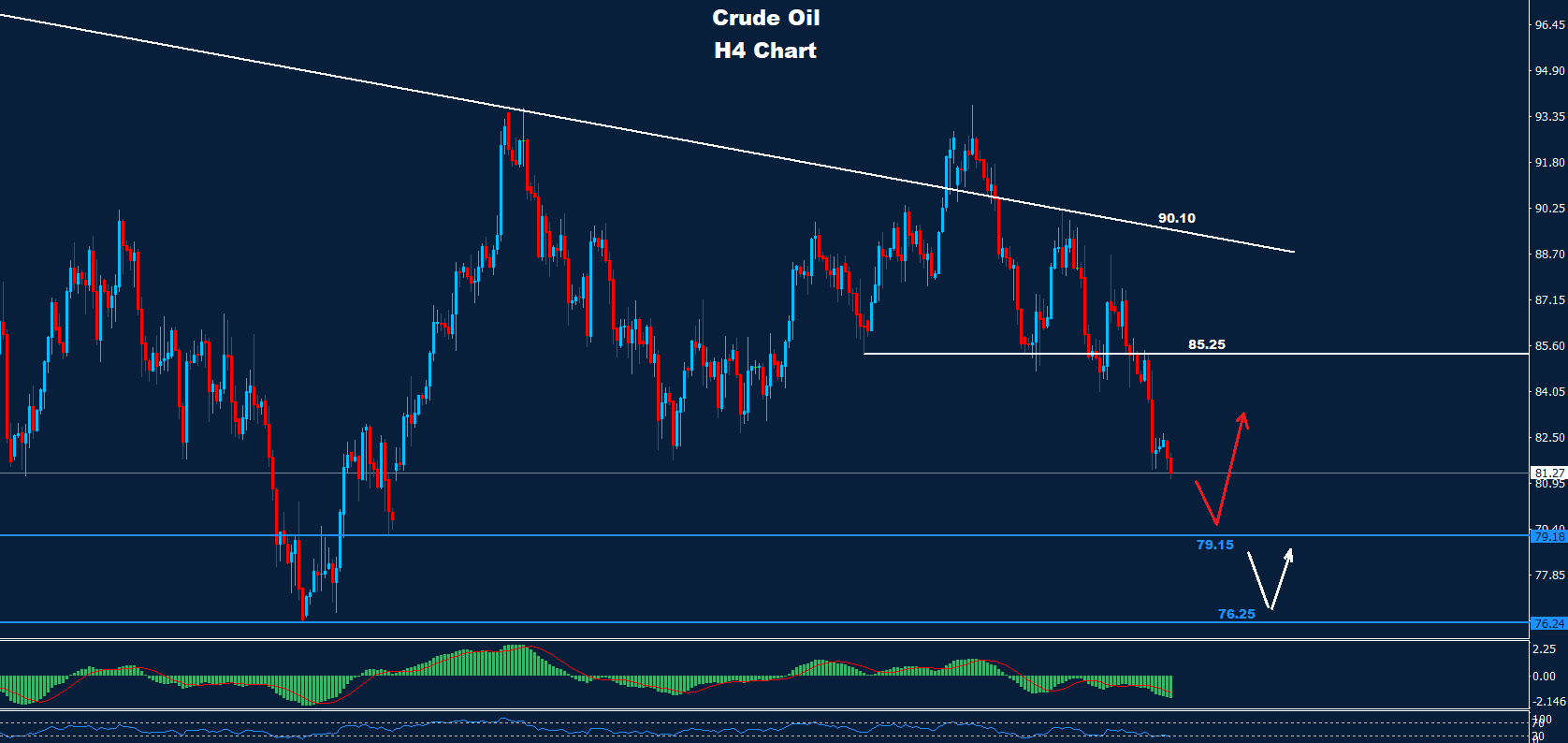 كما نرى على الرسم البياني، يواجه السوق مقاومة حول 82.65 و 85.25 بينما يواجه السوق دعماً حول 79.15.