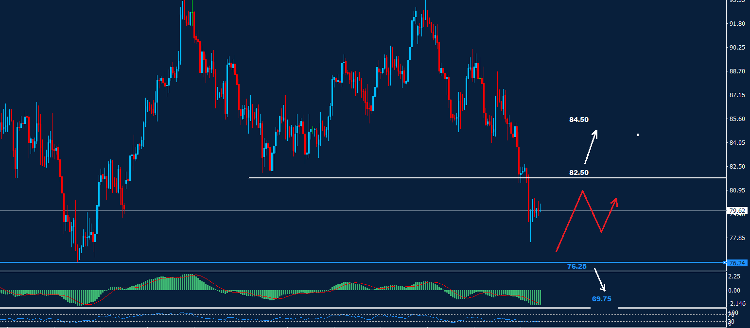 كما نرى على الرسم البياني، يواجه السوق الدعم القديم حول 76.25 بينما توجد المقاومة حول 82.50 حيث قد يحتفظ السوق بمنطقة التداول هذه لبعض الوقت.