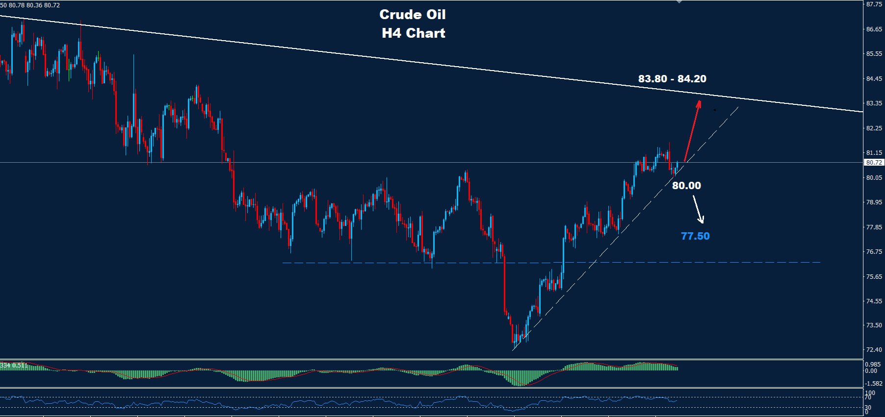 كما نرى على الرسم البياني، تظهر مستويات التداول اليومي أول دعم يقع حول منطقة 80.00، طالما أن السوق يحتفظ بالتداولات فوق هذا الدعم فقد تستمر حركة الصعود نحو منطقة المقاومة 83.60-84.20