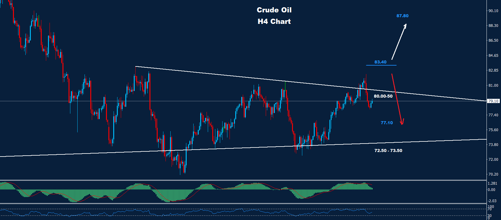 فشل النفط الخام في اختراق منطقة المقاومة 83.40 حيث تمكن السوق من تحقيق الهدف الأول عند 77.10 اليوم.