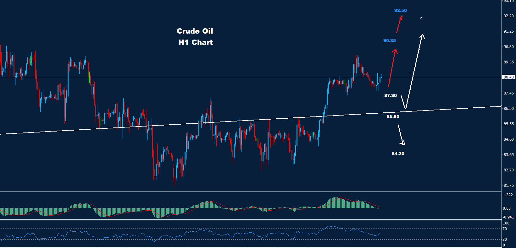 تمكن النفط الخام من استئناف التقدم حيث تمكن من تحقيق الهدف 87.15 و89.70 كما أشرنا من قبل.