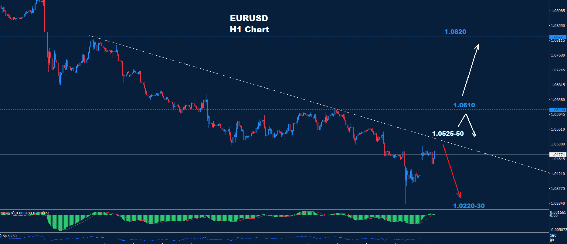 كما نرى على الرسم البياني، لا يزال السوق يواجه مقاومة الترند الهابط حول 50-1.0525. طالما أن السوق يستمر في الاحتفاظ بالتداولات تحت هذه المقاومة فإن ضغط الاتجاه الهبوطي لا يزال مستمراً لمزيد من الهبوط نحو 1.0220