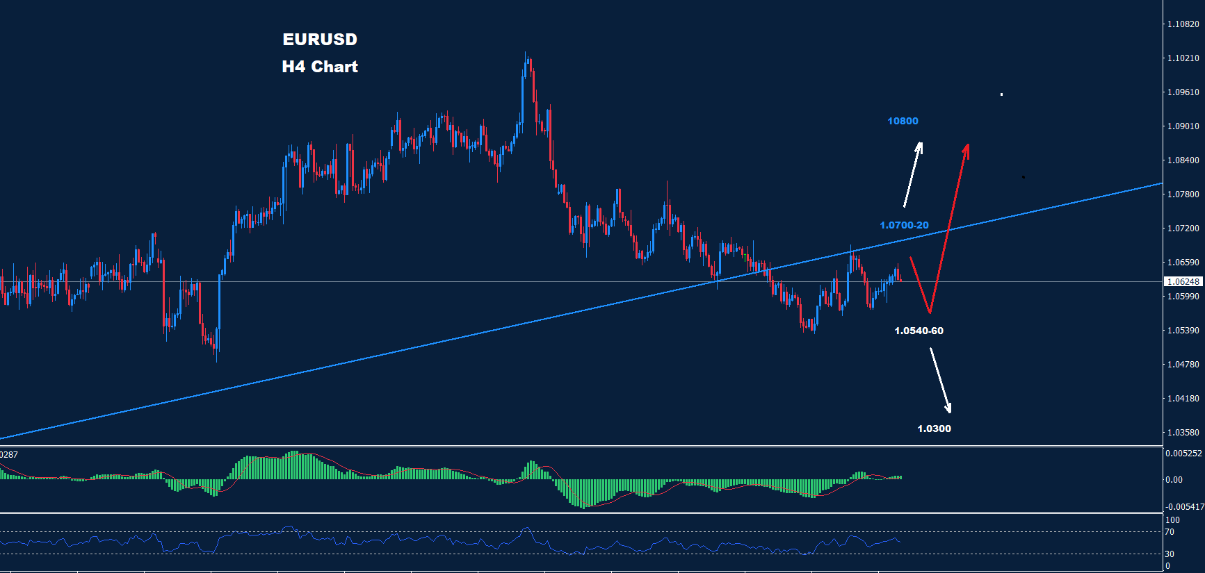 كما نرى على الرسم البياني، يواجه السوق منطقة دعم حول 60-1.0540 بينما المقاومة حول 20-1.0700 والتي قد تحتفظ بمنطقة تداول قبل التقدم نحو 1.0800.