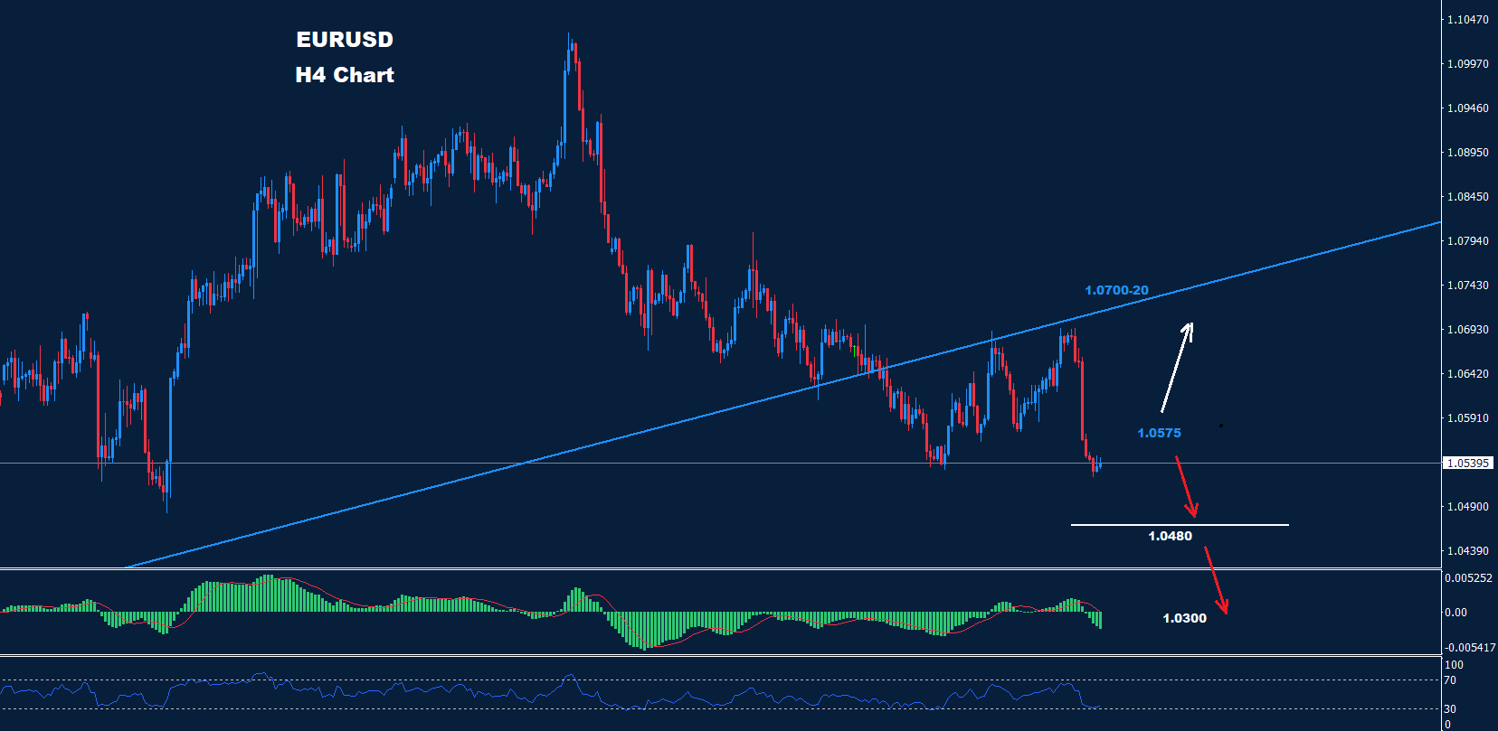 كما نرى على الرسم البياني، يواجه السوق مقاومة حول 1.0575، حيث طالما السوق متماسك تحتها فإن حركة هبوط أخرى قد تضرب السوق لاختراق الدعم 1.0480 والتوجه نحو 1.0400 و1.0300 ستكون متوقعة.