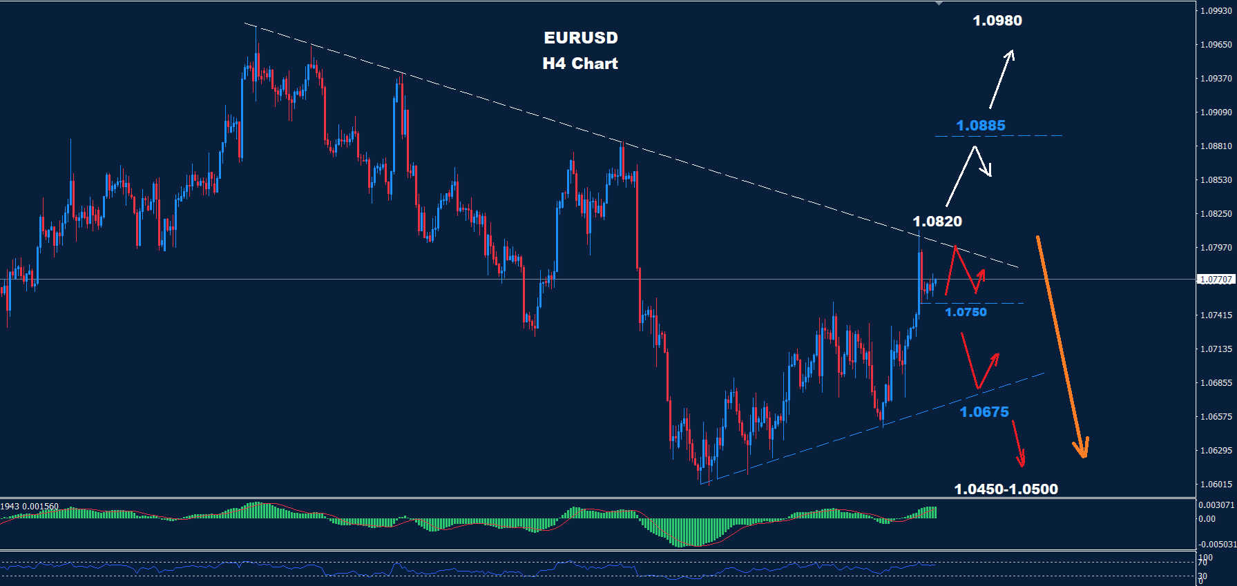 لا تزال موجة الاتجاه الهبوطي نحو منطقة 1.0445-1.0500 سارية طالما استمر السوق في الحفاظ على التداولات تحت مستوى المقاومة 1.0820