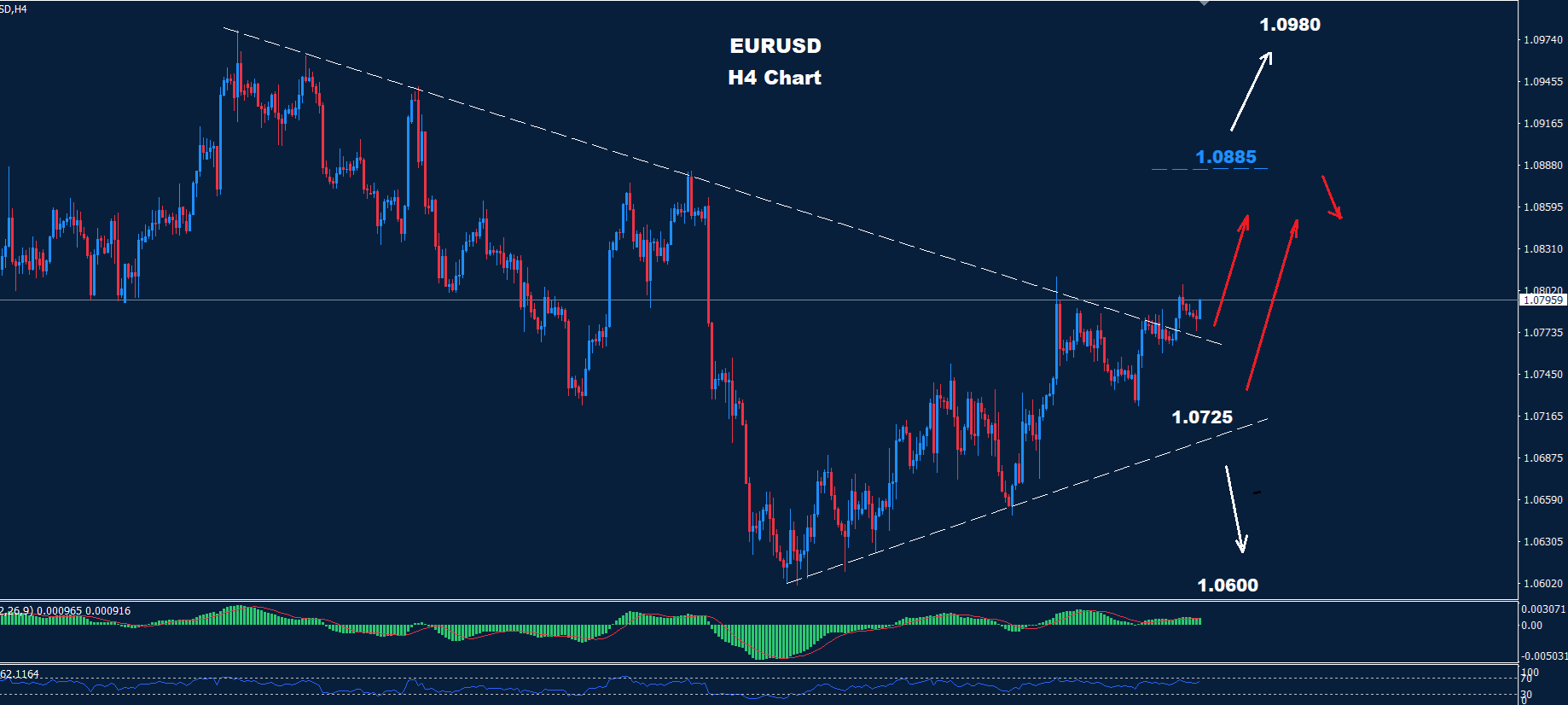 تمكن اليورو من الوصول إلى ما فوق مستوى المقاومة 1.0785 حيث يتداول السوق الآن فوق ترند المقاومة كما نرى على الرسم البياني.