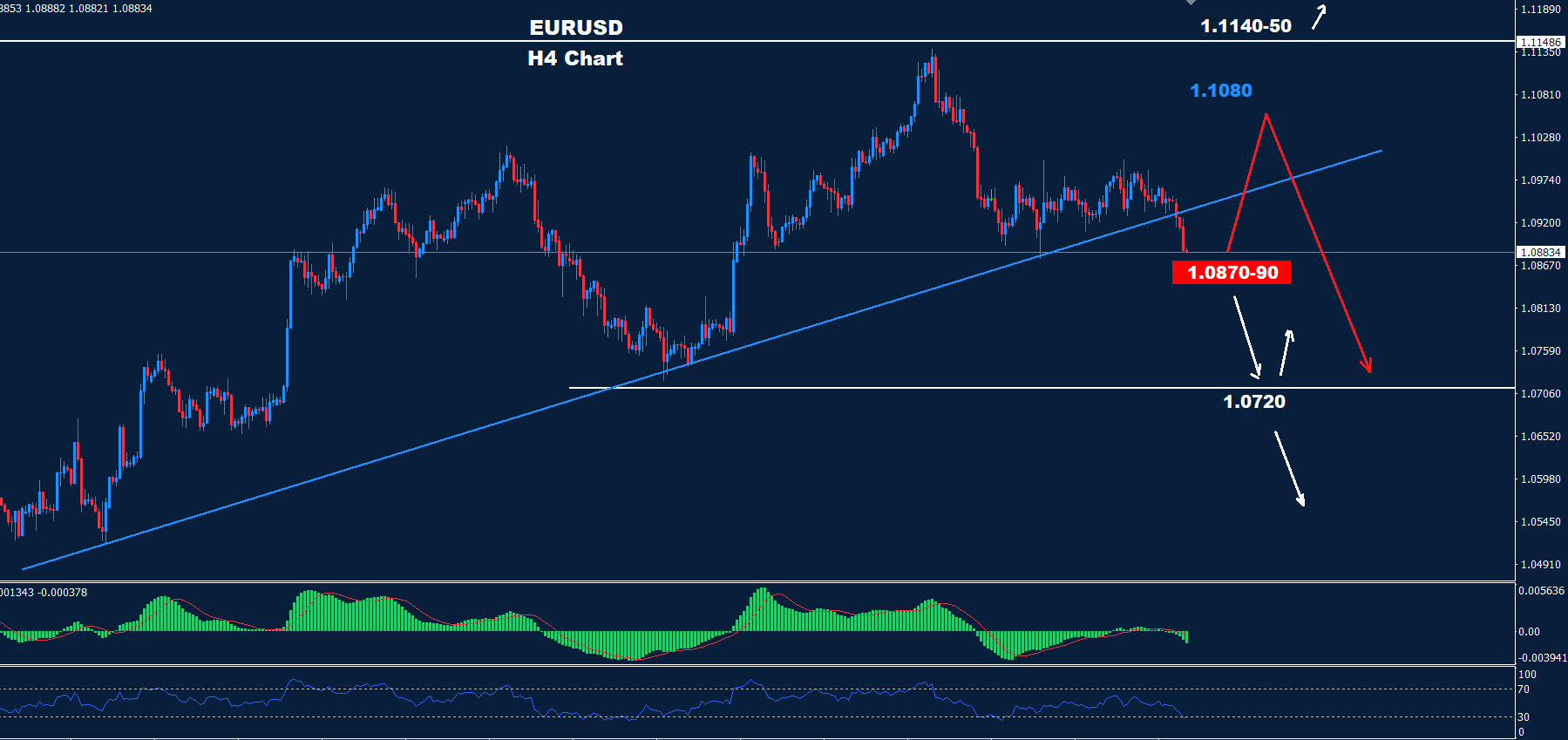 تمكن اليورو من جديد من إعادة اختبار هدفنا ومنطقة الدعم 90-1.0870 مع وجود إشارات بأن الاختراق تحت هذا الدعم قد يكون قريباً.