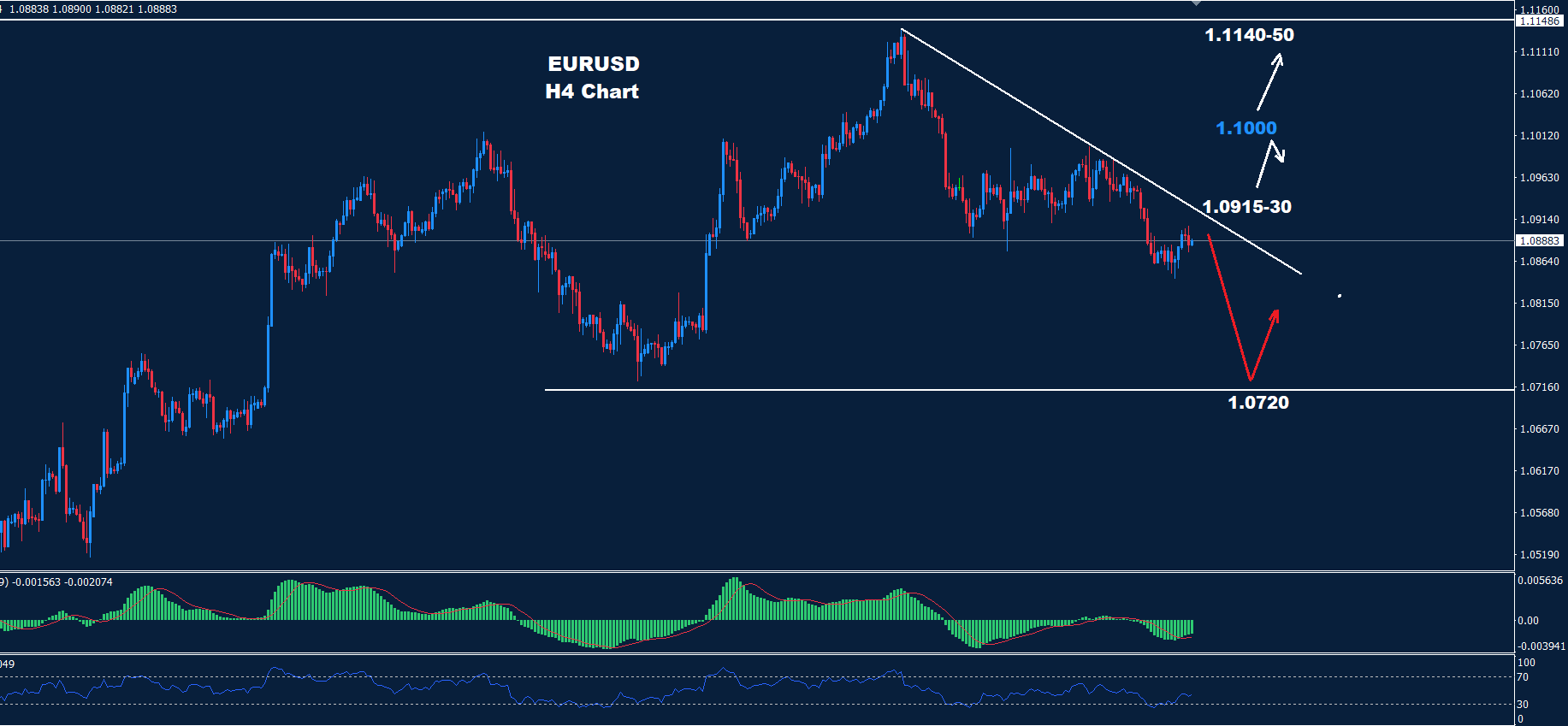 كما نرى على الرسم البياني، يظهر السوق منطقة مقاومة حول 30-1.0915 حيث طالما استمر السوق في الحفاظ على التداولات تحتها، فقد يستمر ضغط الاتجاه الهبوطي حيث يقع الدعم حول 1.0720.