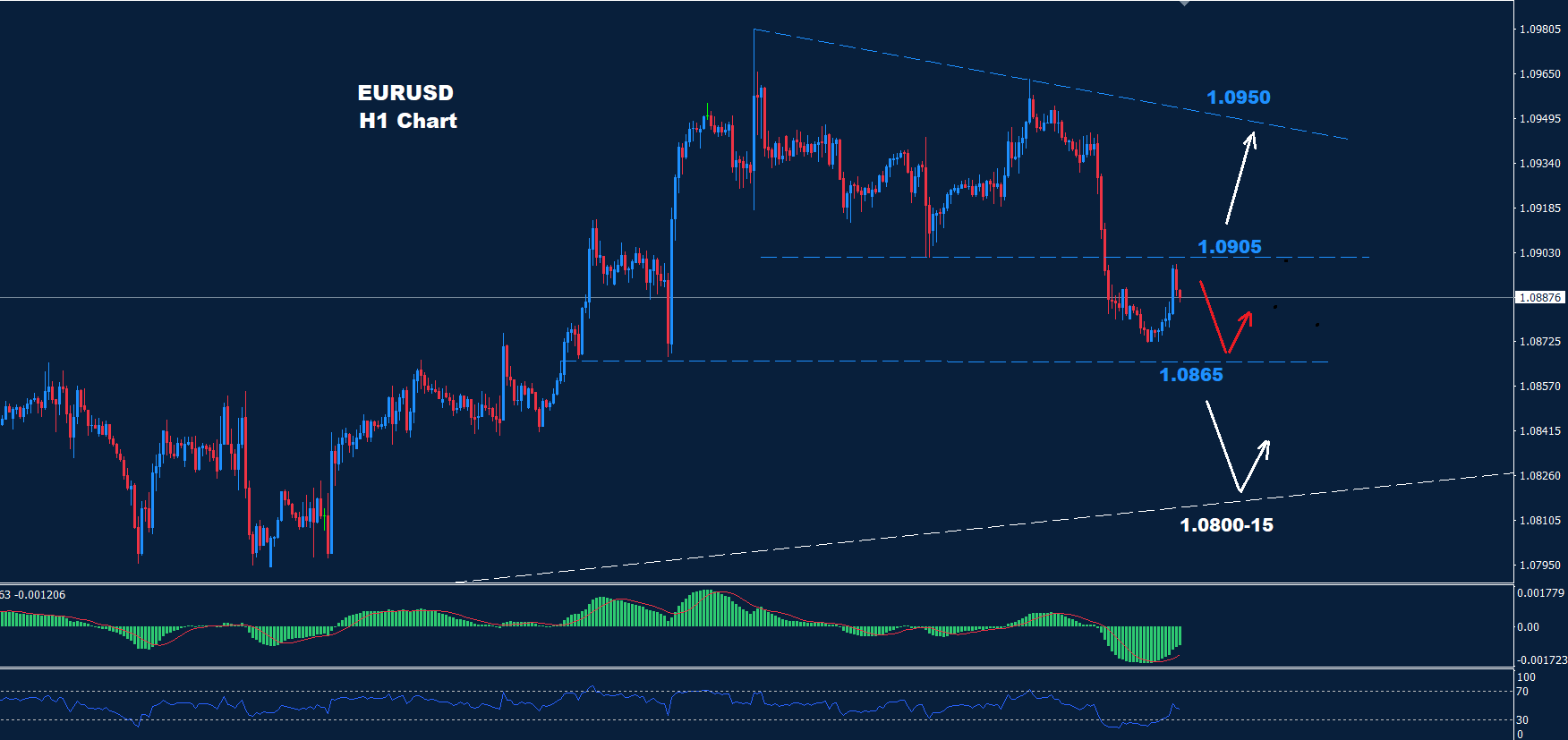 تحت 1.0865، من المتوقع حدوث المزيد من الانخفاض نحو منطقة الدعم 15-1.0800 والتي بدورها قد تدفع نحو بعض التصحيح الارتدادي.