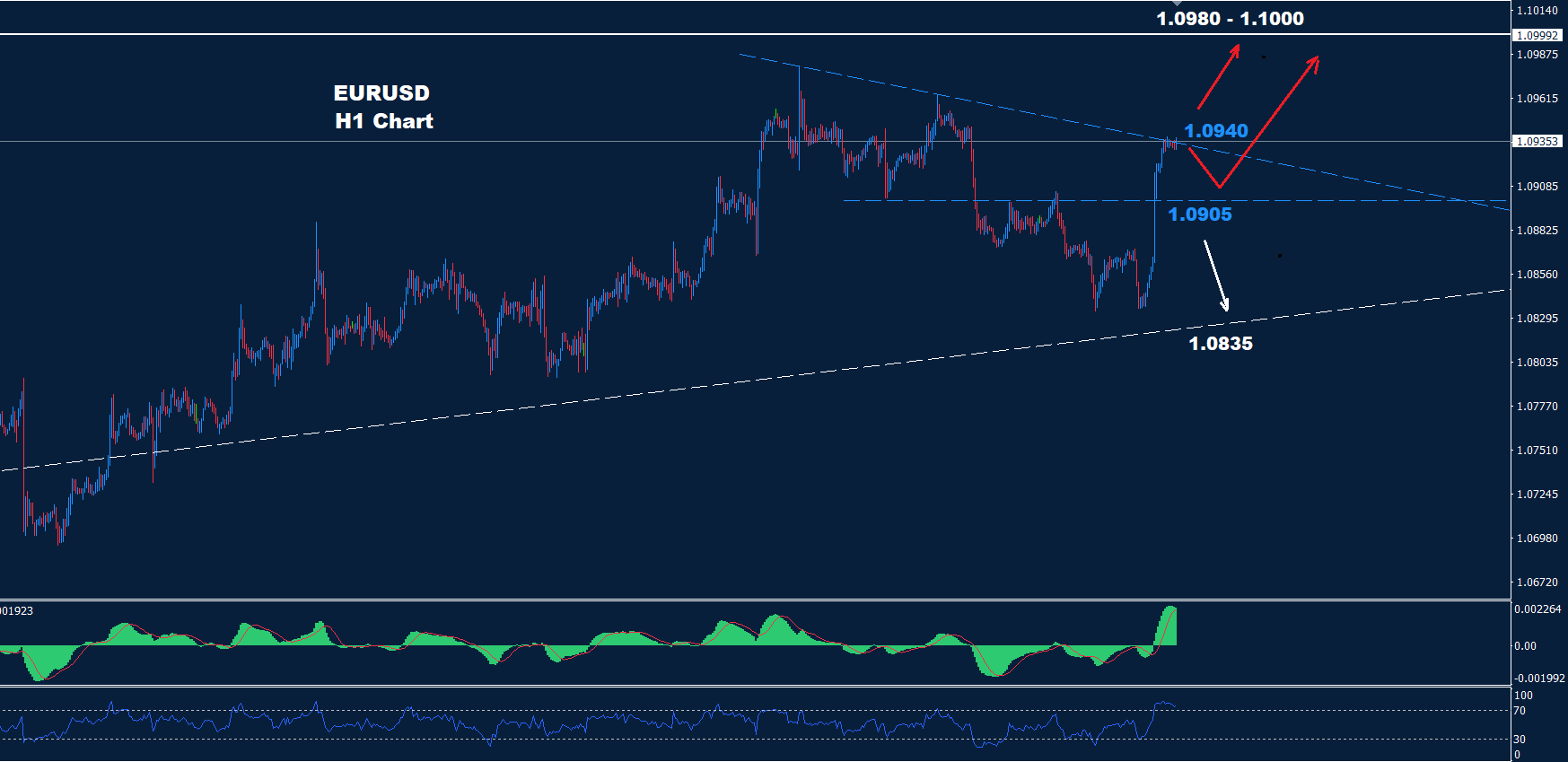 كما نرى على الرسم البياني، يواجه السوق مقاومة ضمن المدى اليومي حول 1.0940 بينما الدعم حول 1.0905 والذي قد يحافظ على منطقة تداول صغيرة قبل أن يواصل السوق التقدم نحو 1.0980-1.1000