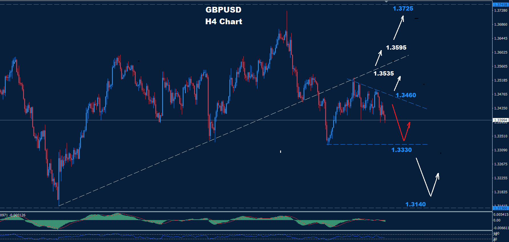 أما تحت مستوى 1.3330، فمن المتوقع المزيد من الانخفاض، مع وجود دعم عند مستوى 1.3140.