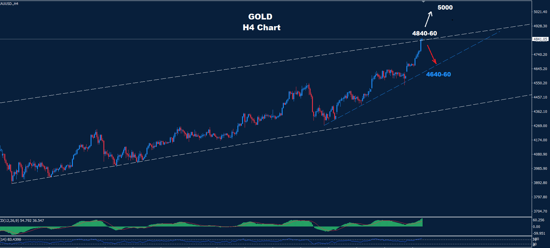 كما هو موضح في الرسم البياني، يواجه السوق منطقة مقاومة عند مستوى 60-4840 ، مما قد يدفع السوق نحو تصحيح هبوطي باتجاه منطقة 60-4640.