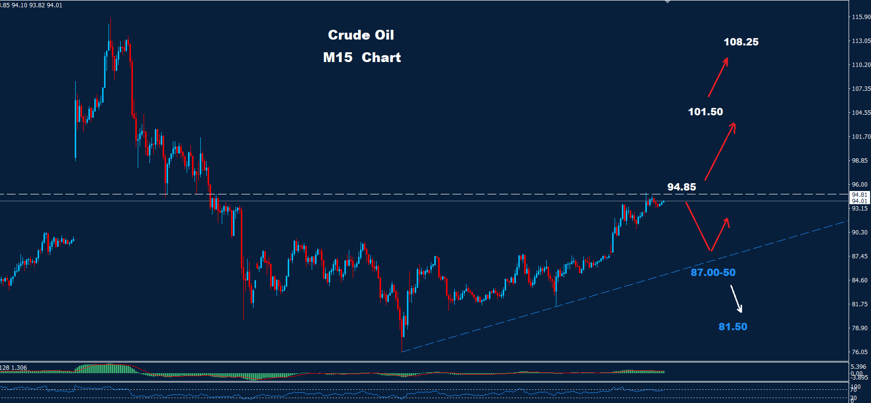 كما هو موضح في الرسم البياني، يواجه السوق مقاومة عند مستوى 94.85، مما قد يتيح فرصة لتصحيح هبوطي، بينما قد يحافظ مستوى الدعم 50-87.00 على استمرار الاتجاه الصعودي نحو 101.50.
