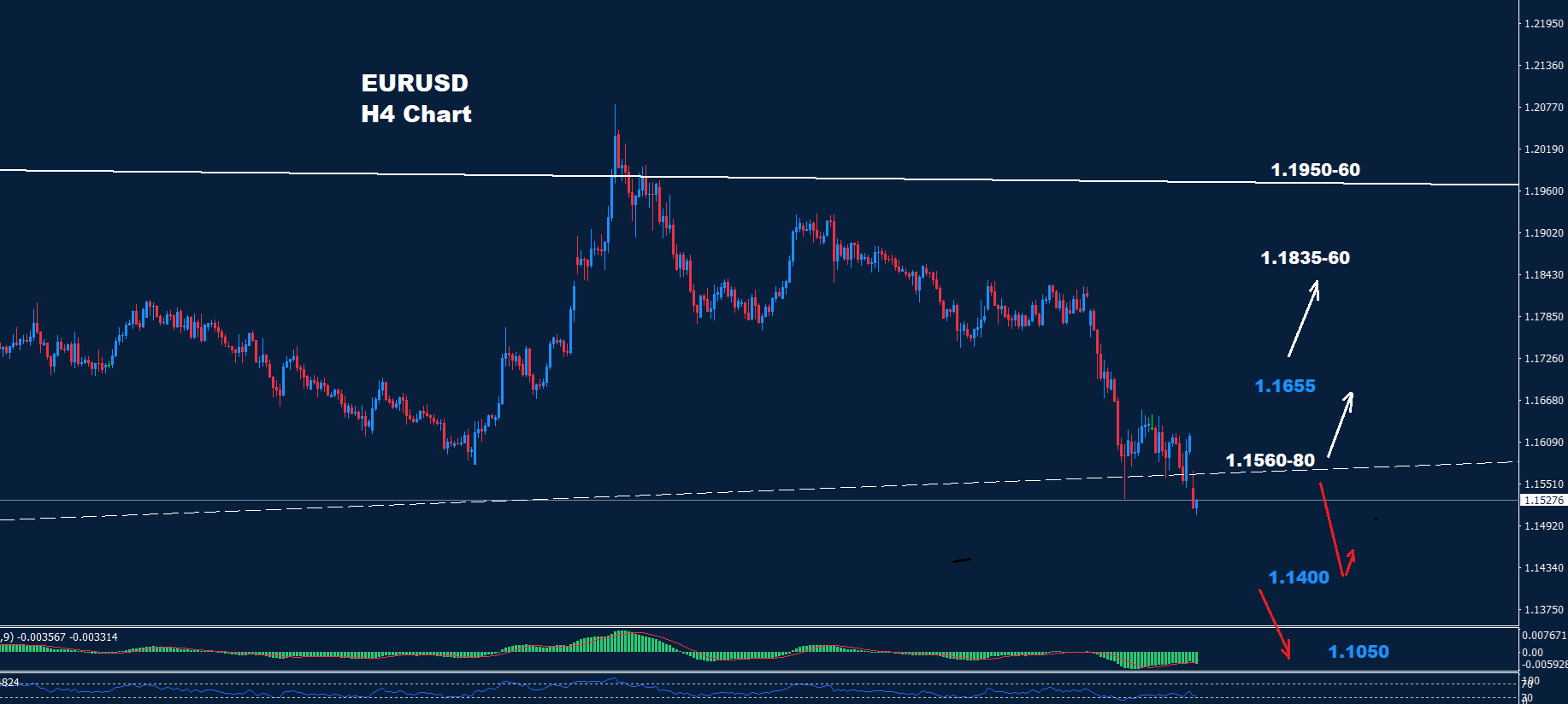 كما هو موضح في الرسم البياني، يواجه السوق منطقة مقاومة عند 80-1.1560 و1.1655، حيث قد يستمر ضغط الهبوط نحو 1.1400 و1.1050.