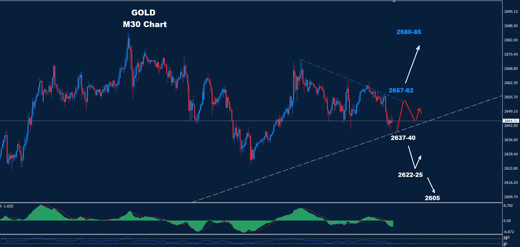 من المتوقع حدوث مزيد من الانخفاض إذا كسر الذهب مستوى 2637، حيث يقع الدعم الثاني عند 2622.