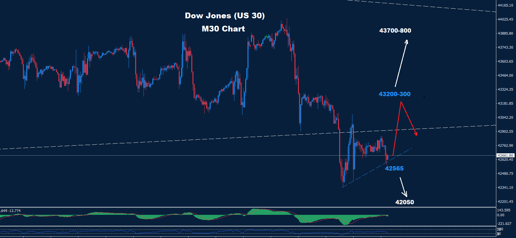 تمكن مؤشر داو جونز من الوصول إلى الهدف 970-42800 وتمكن من الاختراق تحته
