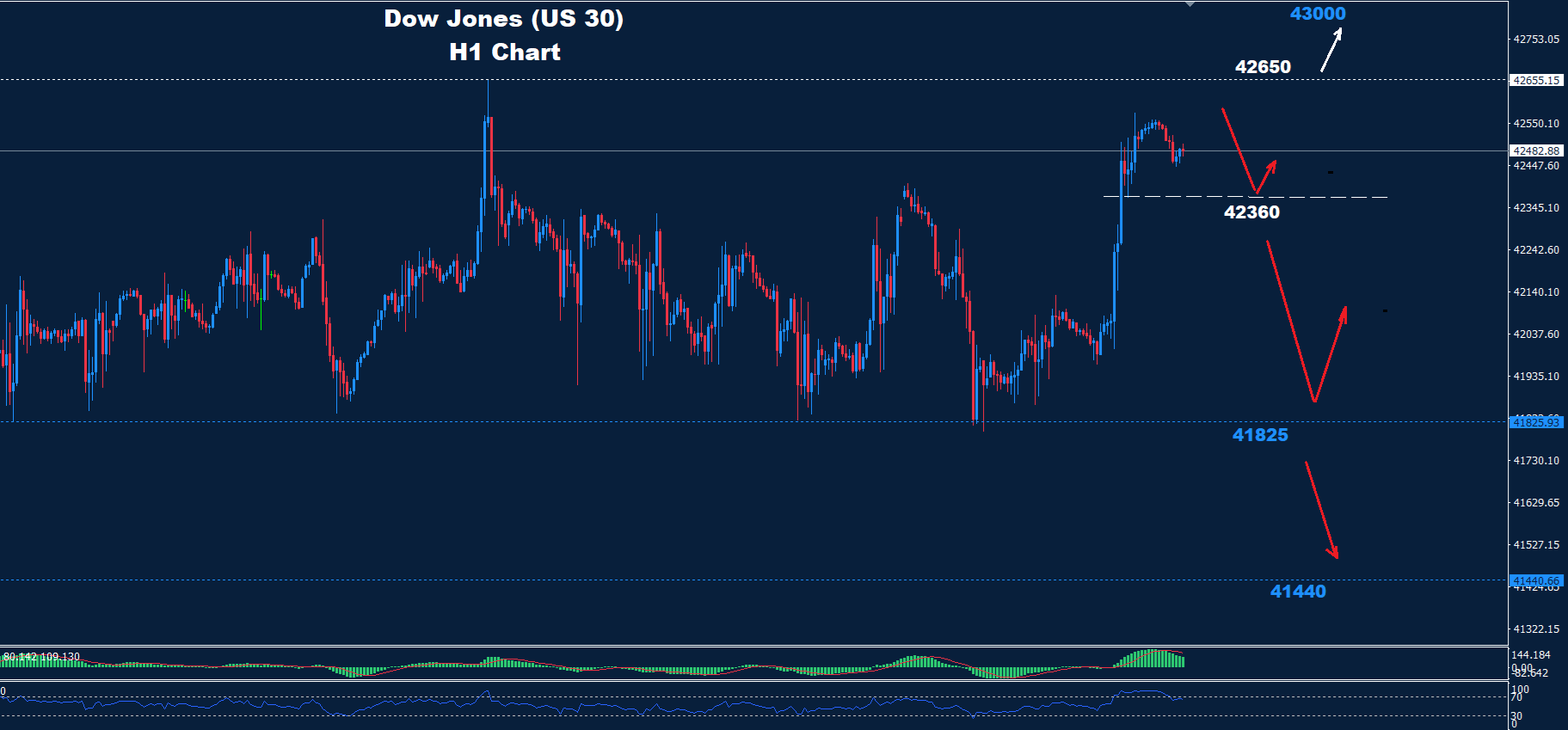 طالما أن السوق يحتفظ بالتداولات تحت 42650 فمن المتوقع موجة هبوط أخرى نحو منطقة 41825