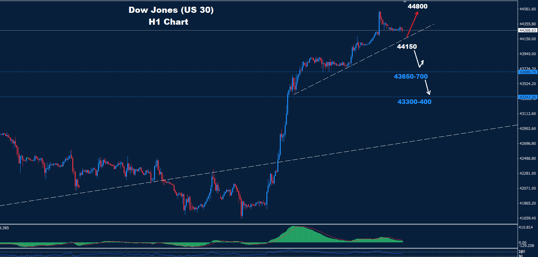 قد يضيف السوق ما دون 44150 مزيدًا من التصحيح الهبوطي حيث توجد مستويات الدعم عند 700-43650 و 400-43300