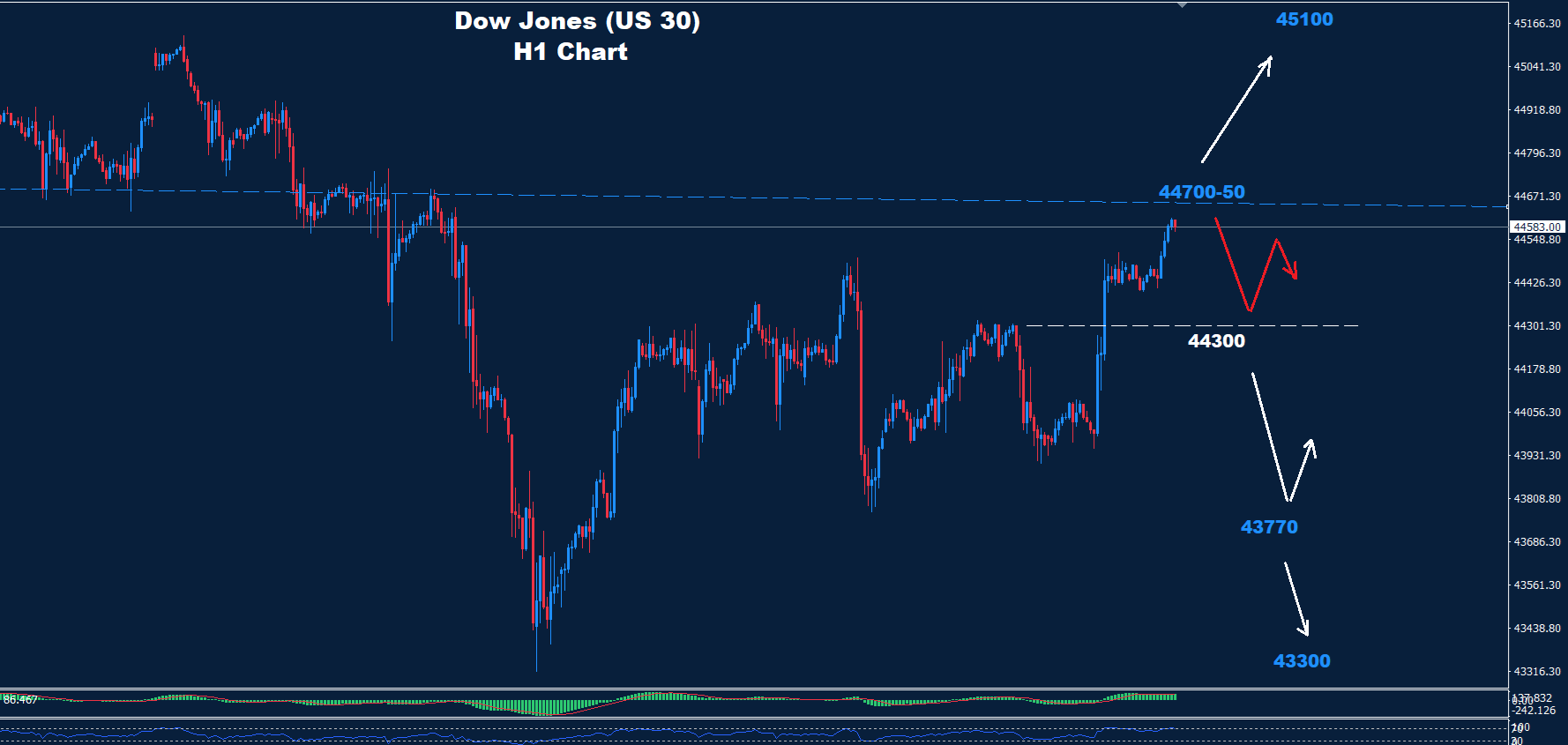 أما في حال تراجع المؤشر دون مستوى 44300، فقد يتعرض لمزيد من الضغط الهبوطي، مع مستويات دعم عند 43770 و43300