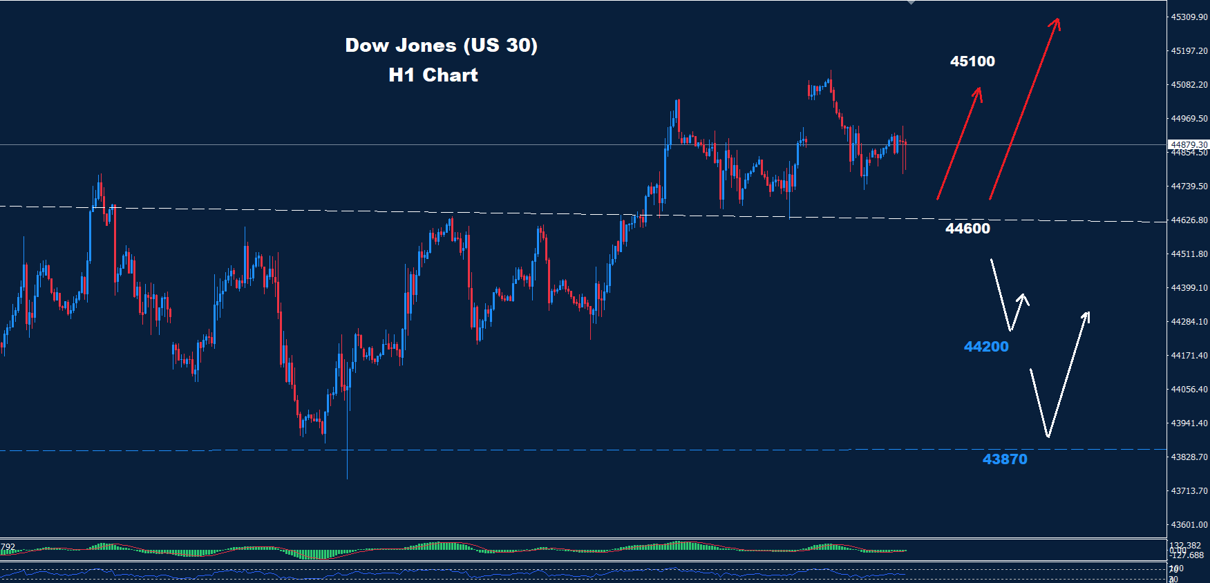أما في حال كسر مستوى 44600 هبوطًا، فقد يتعرض المؤشر لضغوط تصحيحية إضافية، مع أهداف هبوطية محتملة عند 44200 ثم 43870.