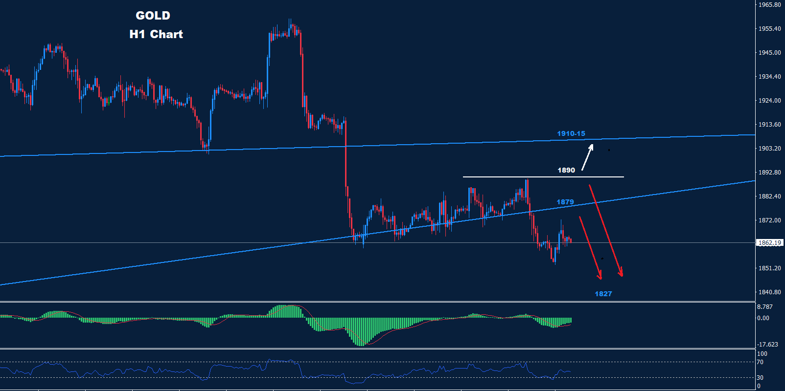 تمكن الذهب من الوصول إلى ما دون مستوى الدعم 1860 مما قد يدفع باتجاه مزيد من الهبوط نحو 1827 كما أشرنا من قبل.